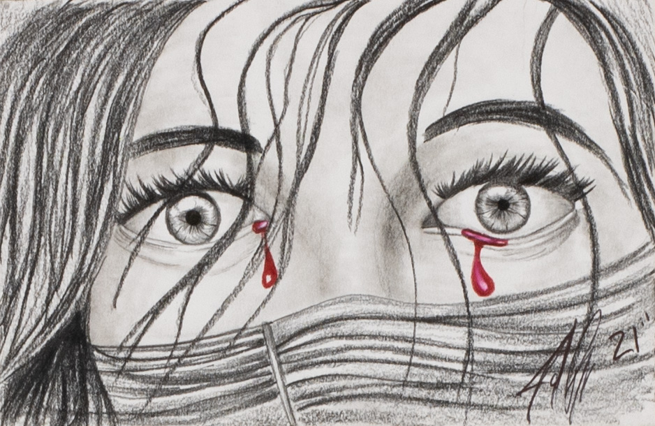 - A close up drawing of a person with long flowing hair and strands covering their face, they are wearing a mask over their nose, and red tears are falling from their eyes.