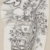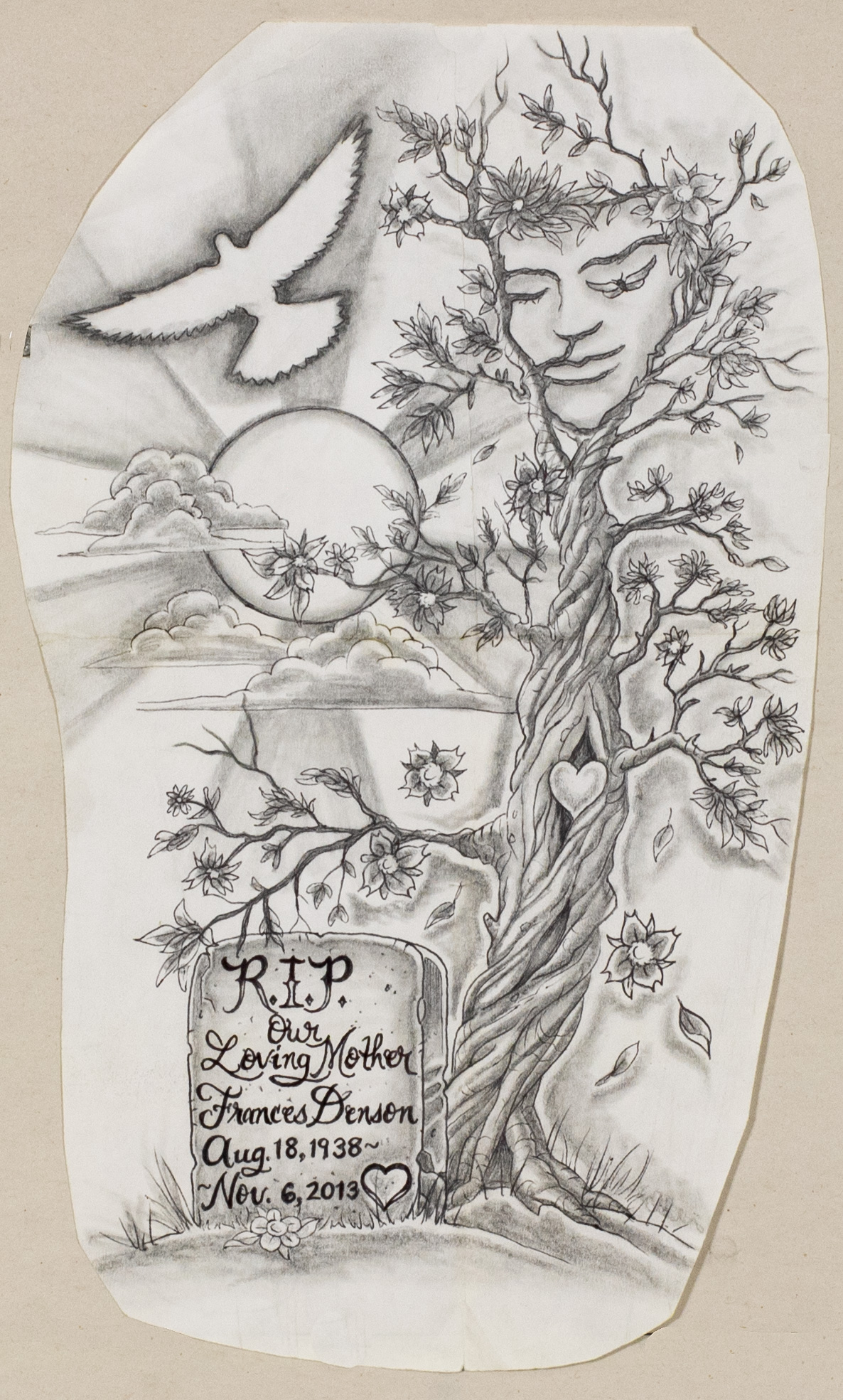 A drawing of a large twisted tree with flowers growing on it's branches and a face at the top of the tree. At the base of the tree there is a a tombstone with cursive words that say, "R.I.P. our loving mother Frances Dendon aug 18-1938-Nov 6 2013." In the background there is a big sun with large sunrays and clouds, and a bird flying in the sky.