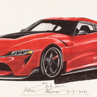 - a realistic drawing of a sleek red sports car with black tires and rims.