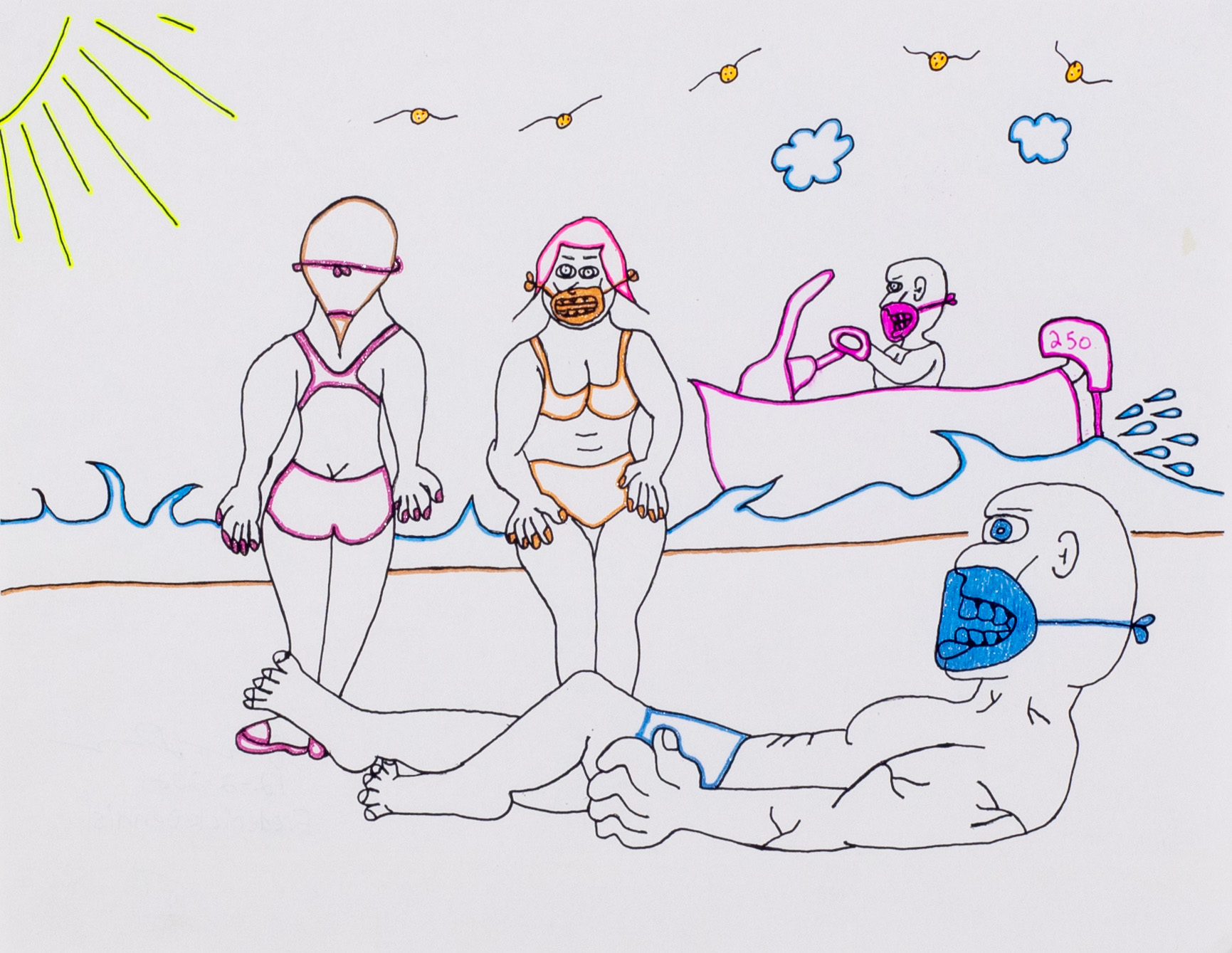 - a line drawing of a beach scene: there are four people on a beach some standing in the sand, one man is laying in the sand, anotehr is in the water driving a small boat. They are all wearing face masks.