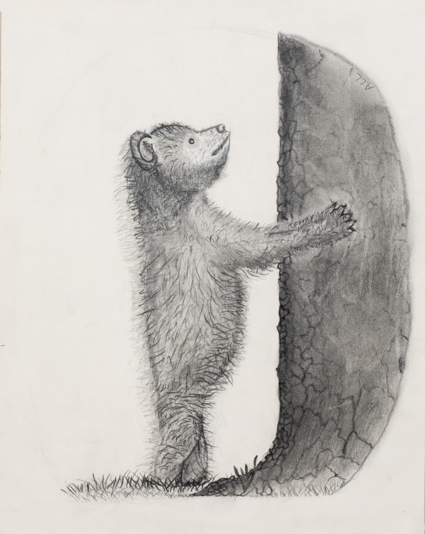 - a drawing of a bearcub standing on its hind legs and its paws holding onto a structure of some kind not much taller than the small cub. The cub looks curiously up at the curved and solid object.
