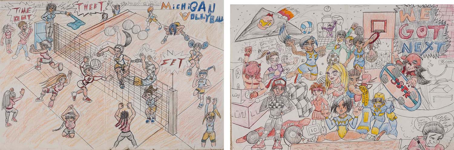 - Pencil, ink pen, colored pencil