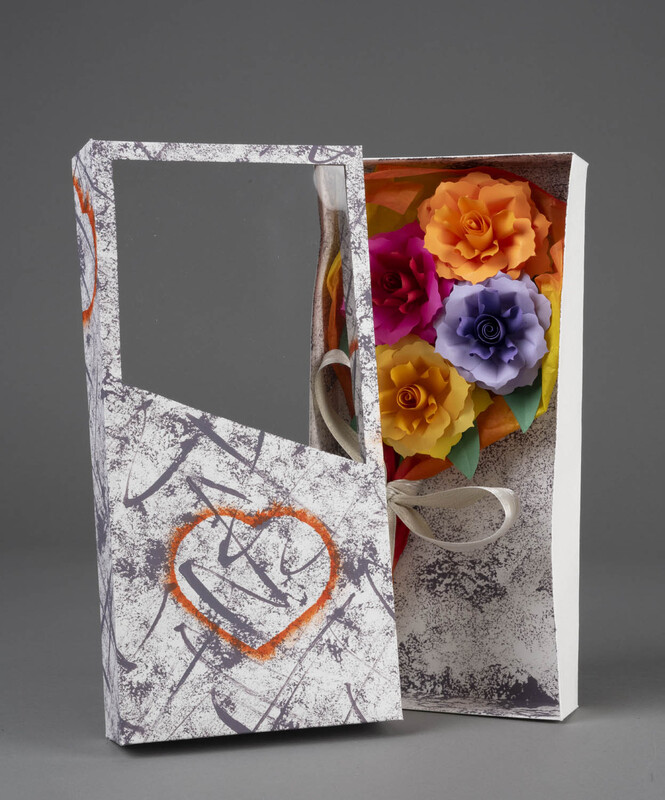 - Colored paper, tissue paper, tag board, acrylic paint, dura-lar, glue, tape, ribbon