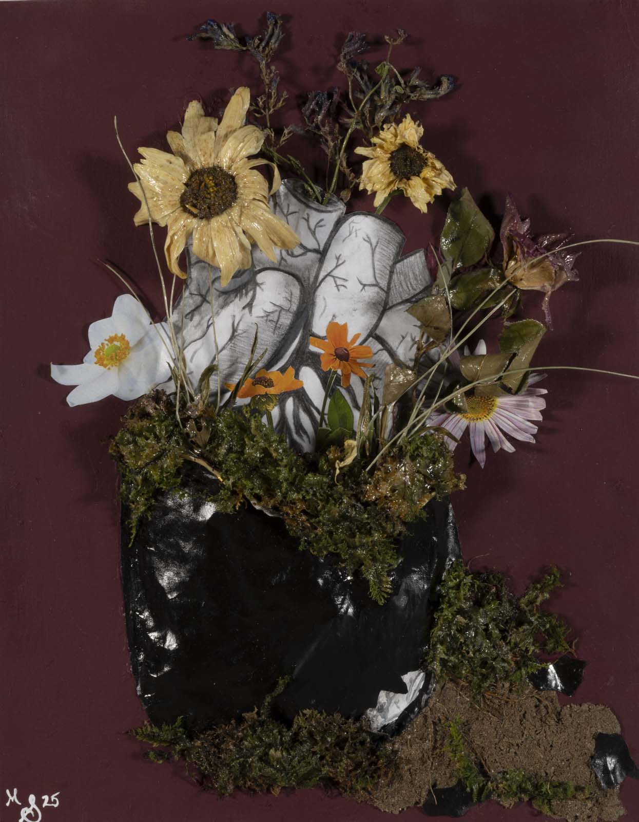 - Flowers, dirt, moss, acrylic paint, pencil, tissue, mod podge