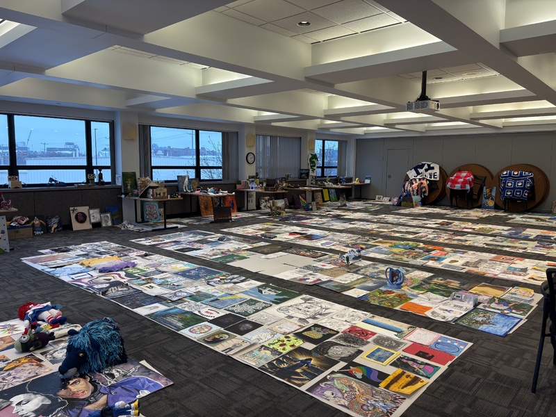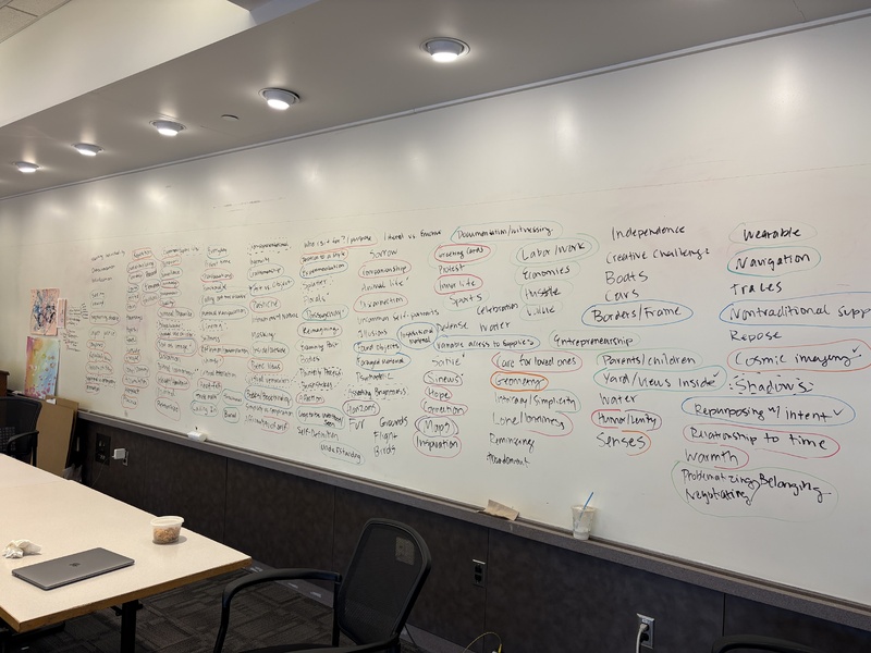 This is the first time that we see all of the art together in one place. Since it is collected facility by facility, it is difficult to imagine how all the work will look when it is together. The day before the design meeting, Emily works with volunteers to display all of the art in a conference room at U-M. Emily leads the Exhibition Design group in a process called thematic analysis–identifying ideas present in the artwork, seeing how those ideas emerge among multiple pieces, and analyzing the themes and stories that these ideas will tell to viewers in the gallery. We spend several hours identifying subject codes, brief descriptions of content or ideas that are present in the art. To do this, everyone looks closely at the art in the room and makes notes about the subject codes that emerge. Sometimes these codes are descriptive, like “portrait,” “abstract,” or “sports.” Others might be about the artistic process, such as “experimentation,” “repetition,” or “repurposing.” Some codes are interpretive and speak to what meaning the viewer sees in the pieces, like “loneliness,” “care,” or “belonging.”